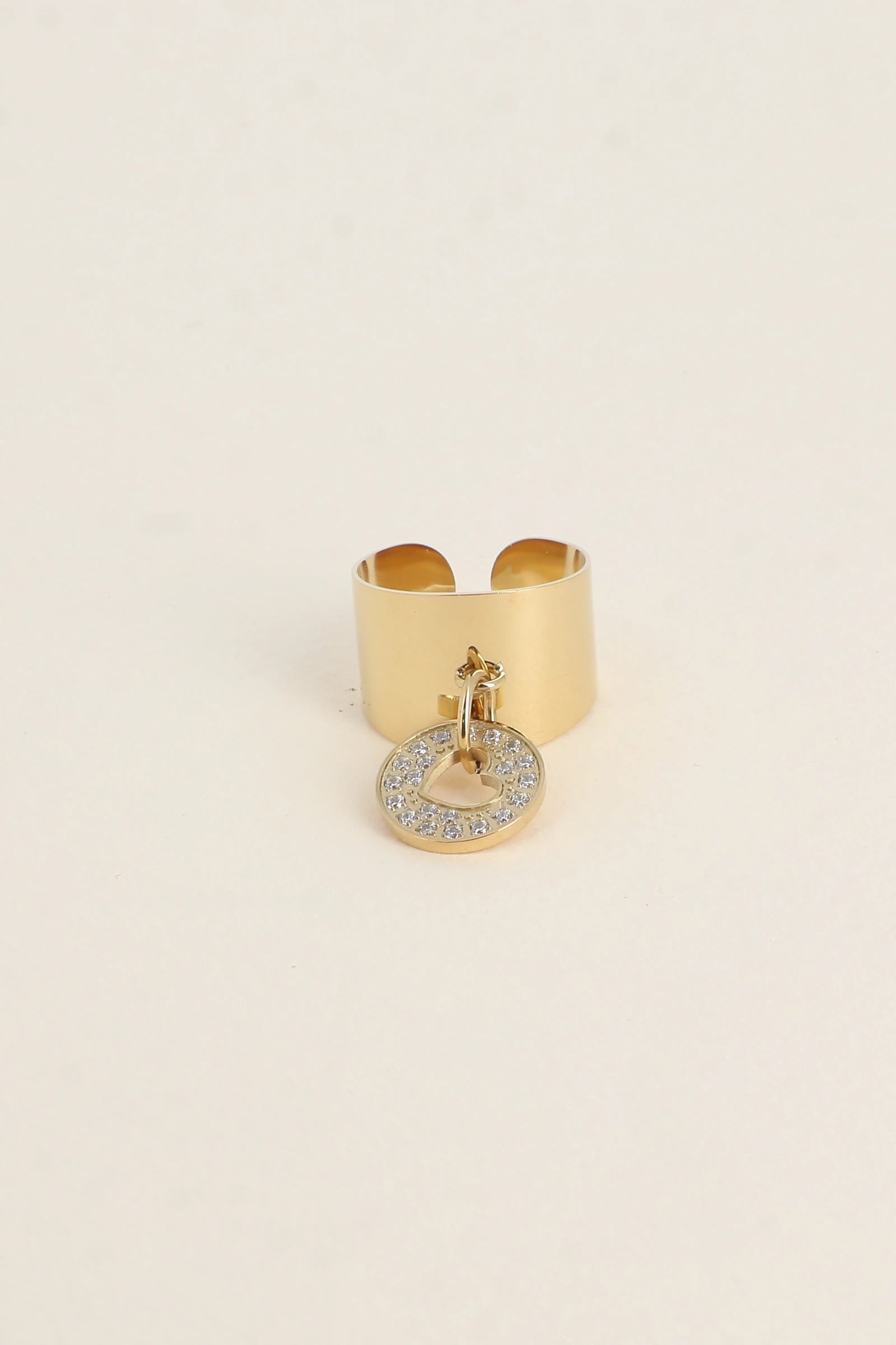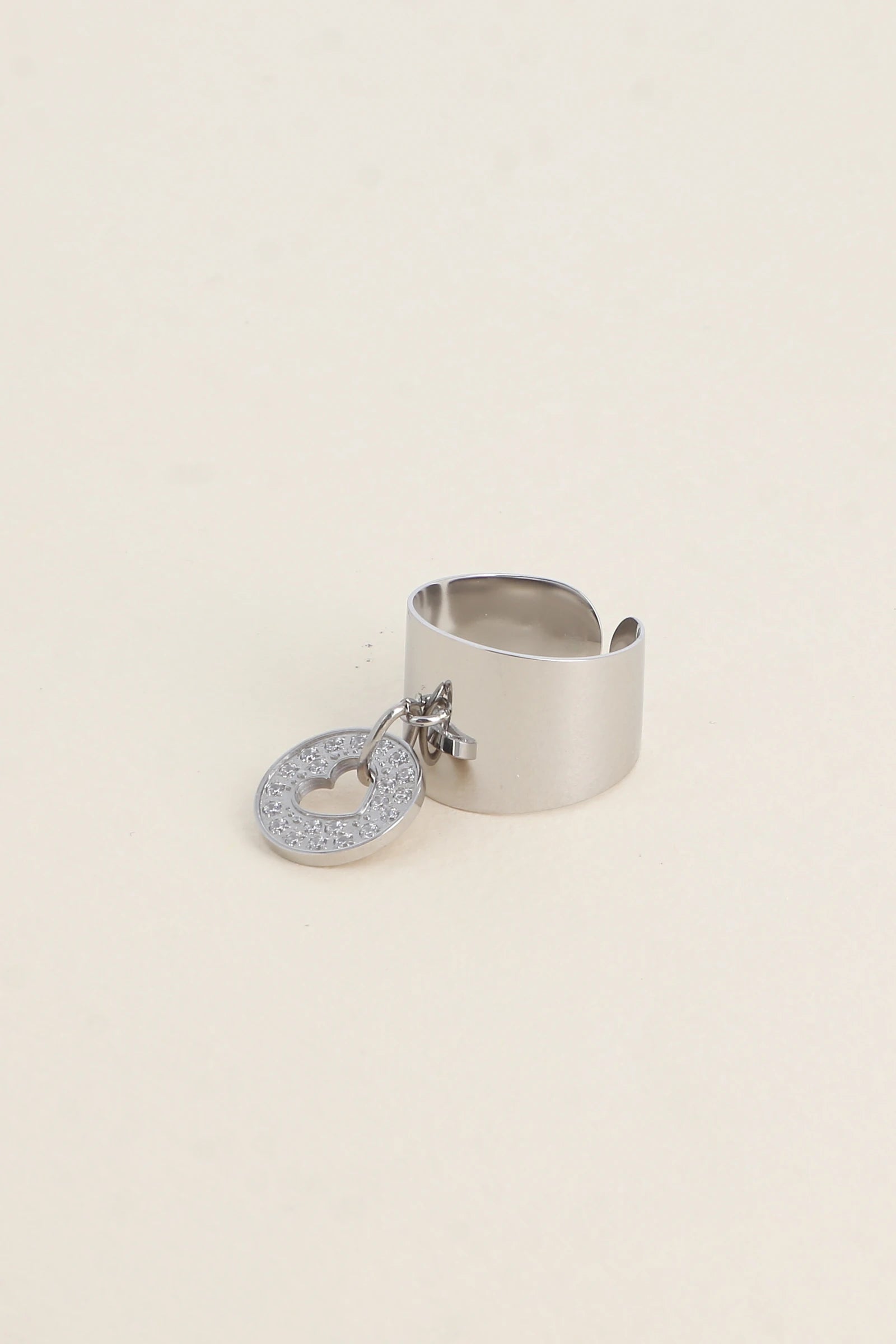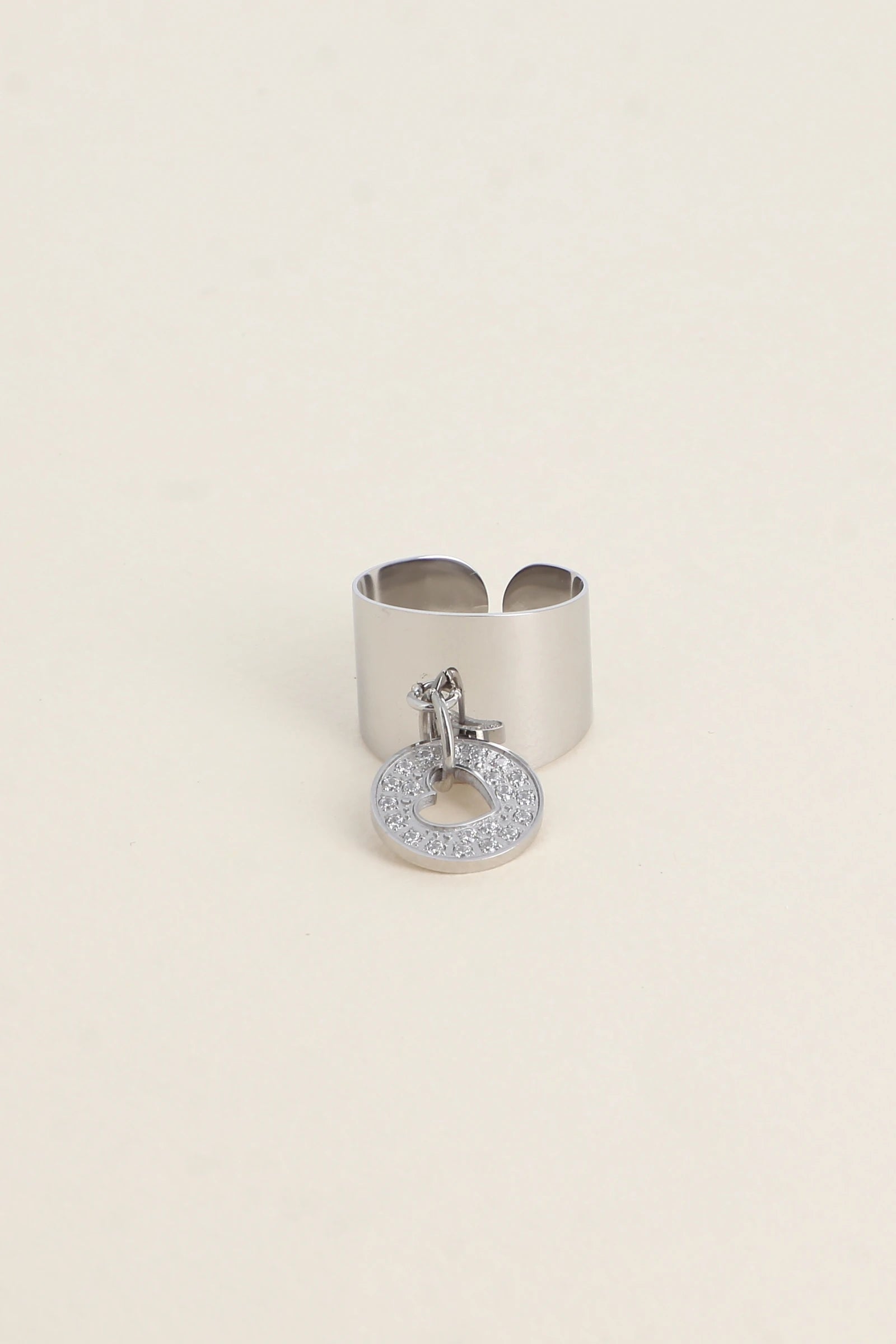 Bague en acier inoxydable effet martelée composée d'un pendentif serti d'oxydes de zirconium et d'un cœur ajouré.