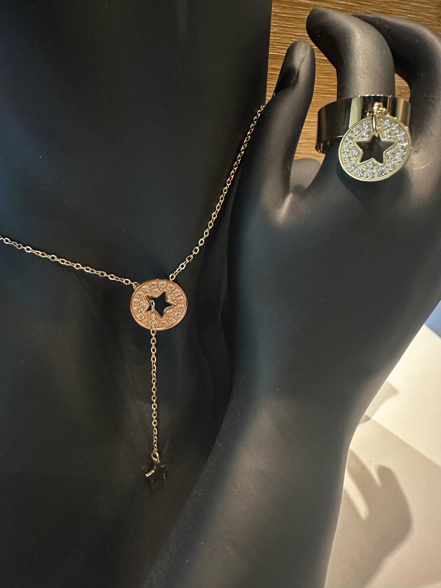 Collier en Y en acier inoxydable composé d'un pendentif serti d'oxydes de zirconium et d'une étoile ajourée.