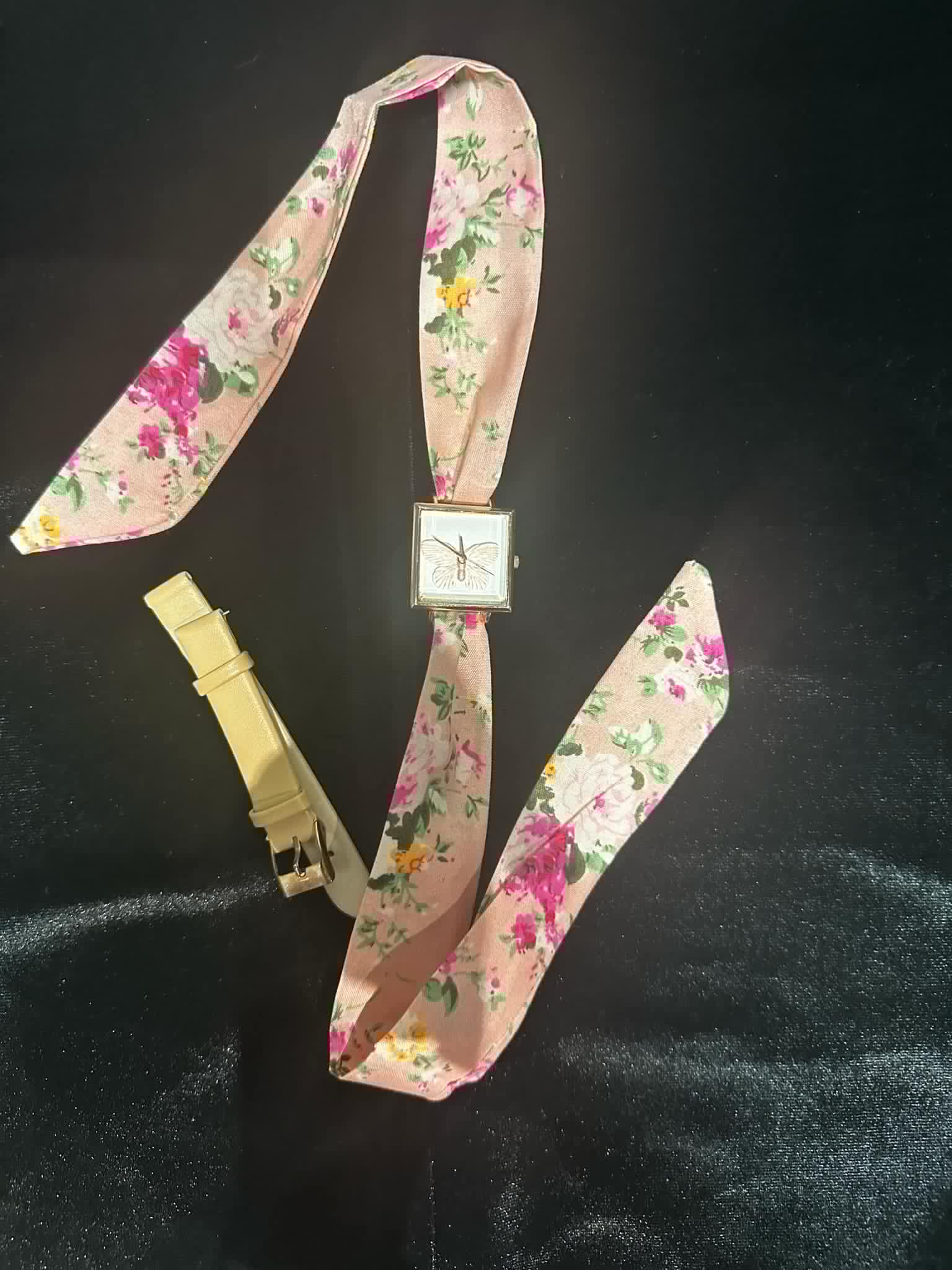 Montre carré papillon ou Libellule Foulard Rose fleuris.