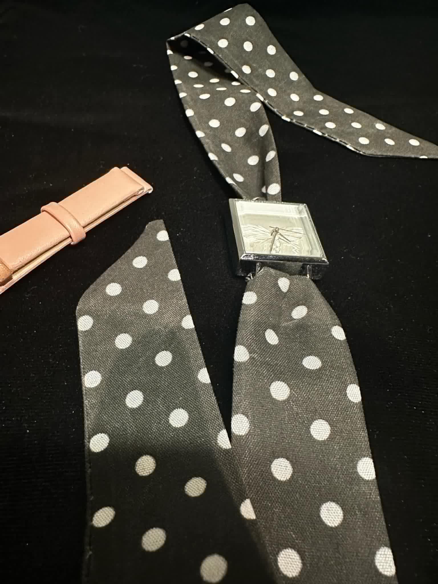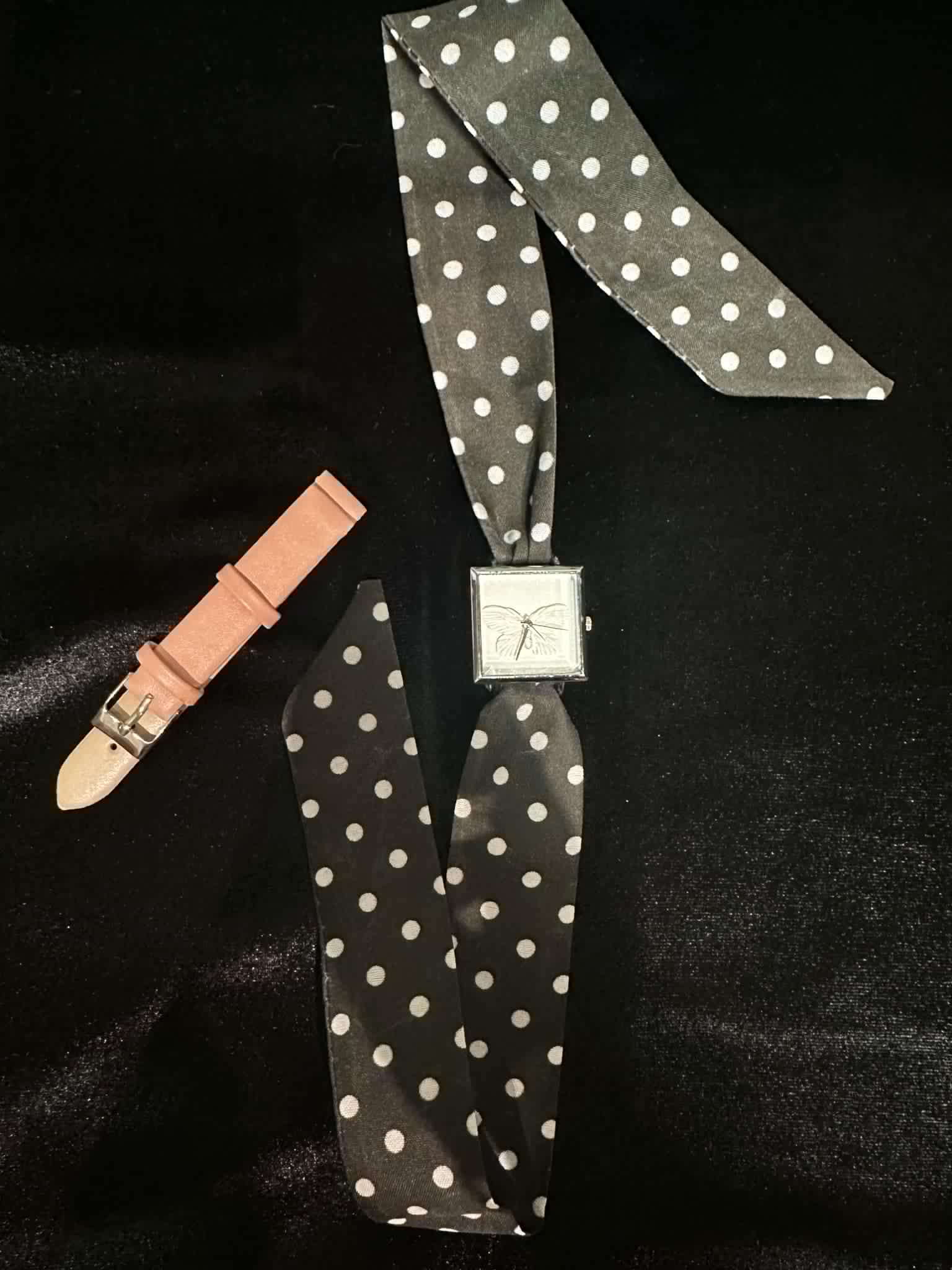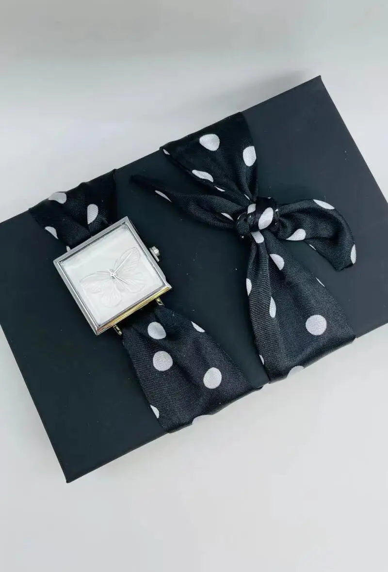 Montre carré papillon blanc avec foulard noir à pois, livrée avec un bracelet similicuir interchangeable pile fourni.