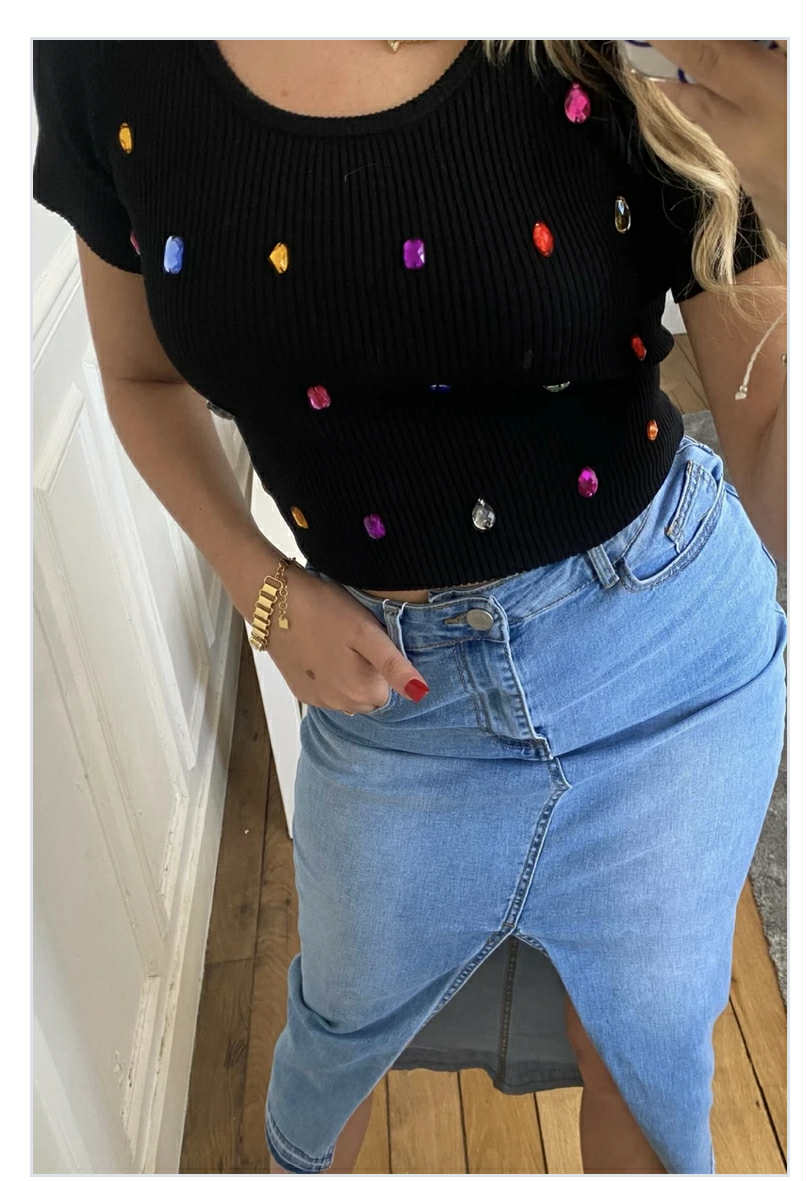 T-shirt noir féminin élégant, nylon et viscose Bijoux de couleurs et extensible.